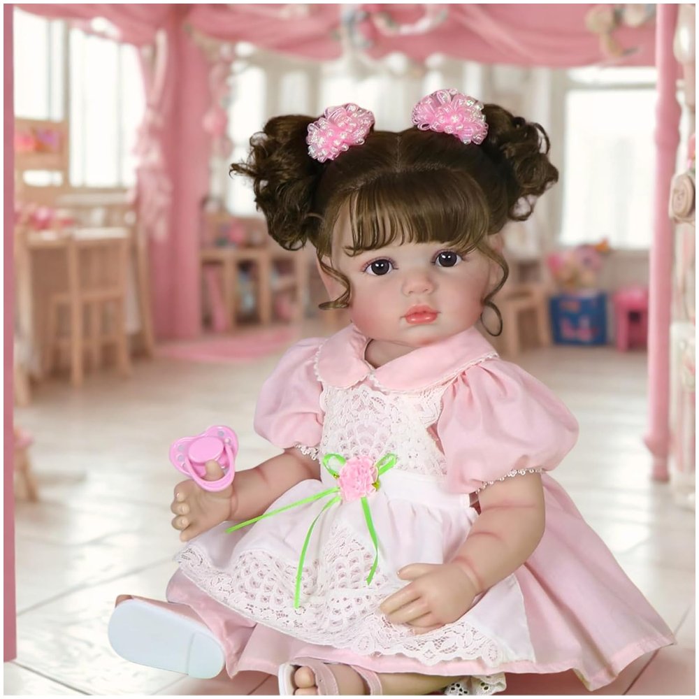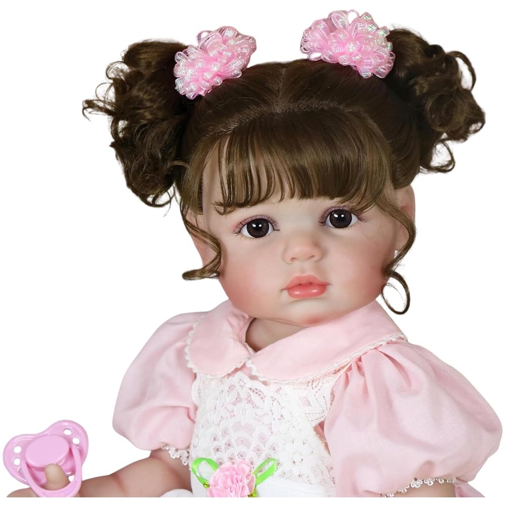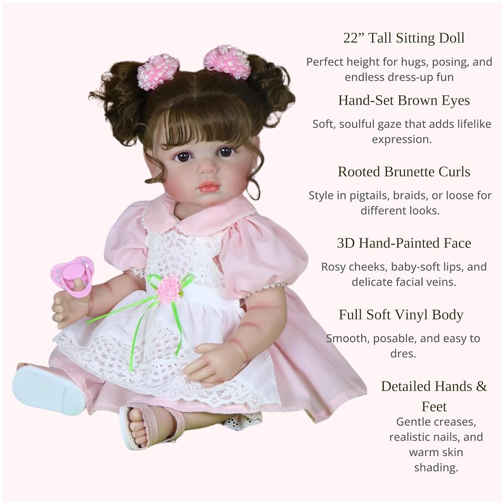 Meet Clara Bloom, a 22-inch lifelike toddler girl who radiates springtime sweetness. With her soft brunette curls, full vinyl body, and hand-painted 3D details, she’s the perfect companion for nurturing play, heartfelt photos, or cherished keepsake moments — crafted with love and realism by Cuddly Dolls.