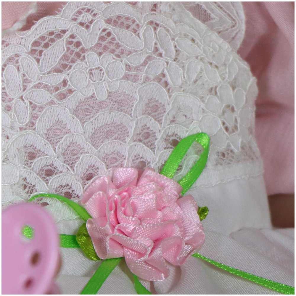 Clara Bloom wears a pink puff-sleeve dress layered with white floral lace and accented by a green ribbon bow. Her matching hair bows and white shoes complete the look — delicate, timeless, and perfect for photos or play. Every piece of her outfit is removable, allowing for creative dressing and personalization.