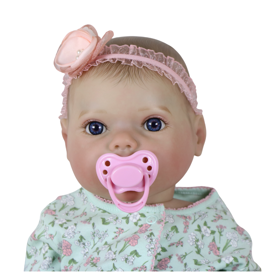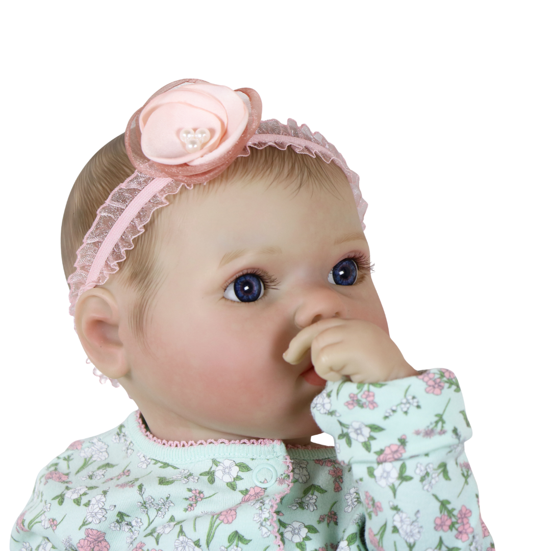 Crafted with a full vinyl body, Emma Rose is soft yet sturdy, allowing for easy dressing, posing, and even gentle water play. Her realistic texture and weight bring an authentic feel to every hug, cuddle, and moment of care. Dressed in a charming floral sleeper paired with a pastel pink flower headband, she radiates comfort and charm, ready for playtime adventures or bedtime stories.