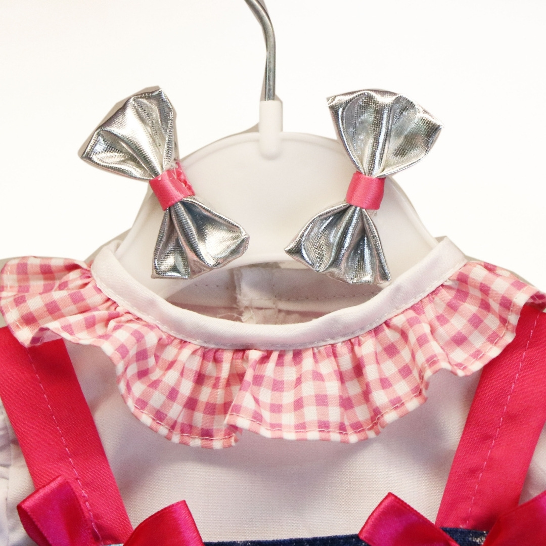 • Four piece set: galaxy dress, puff sleeve gingham trimmed top, bloomers, silver hair bows