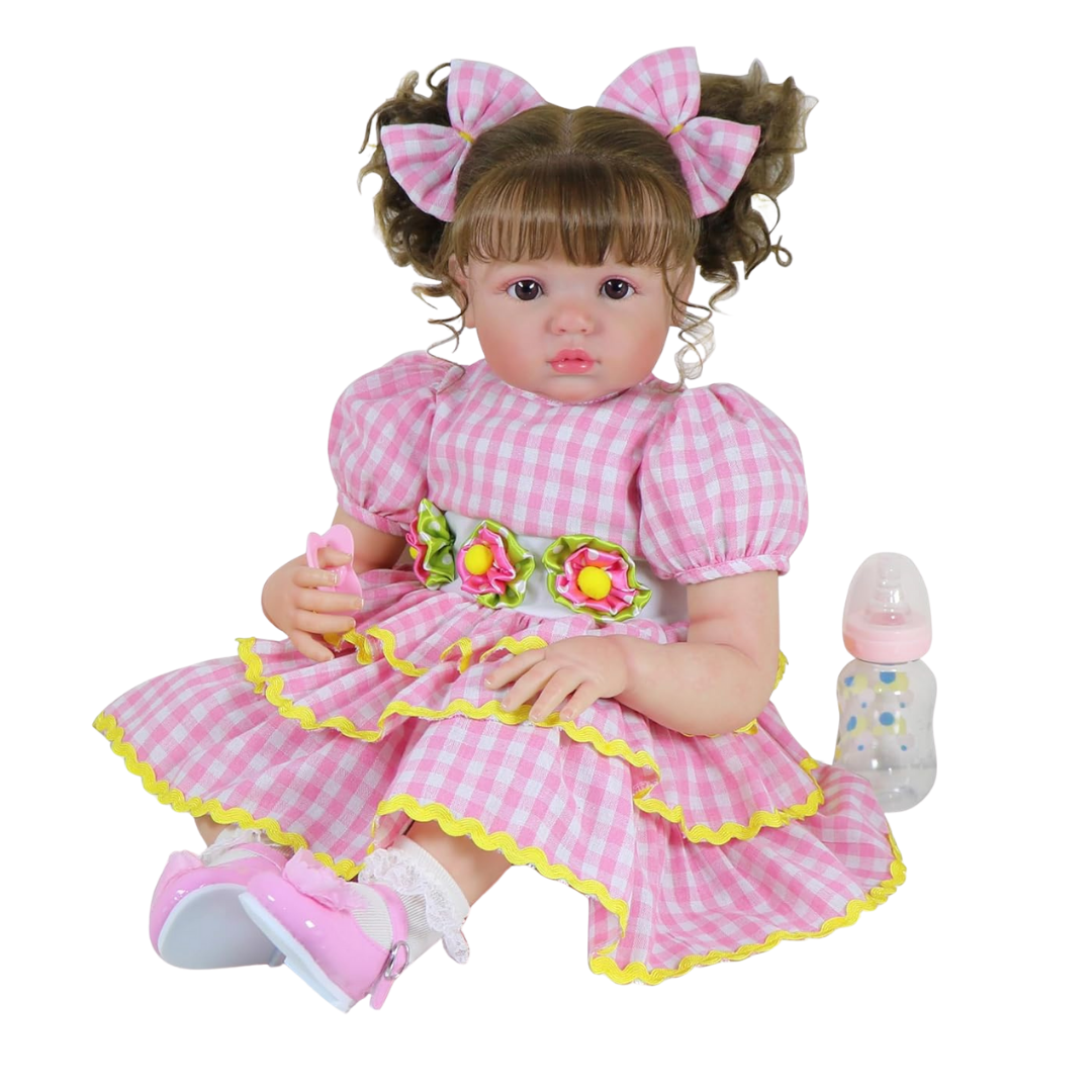 Meet Lila Rose, a 25-inch lifelike toddler doll dressed for pure joy. With rooted curly hair, soft weighted body, and a pink plaid party dress trimmed in yellow, she’s designed for hugs, play, and picture-perfect memories. The ultimate gift for doll lovers and collectors alike.