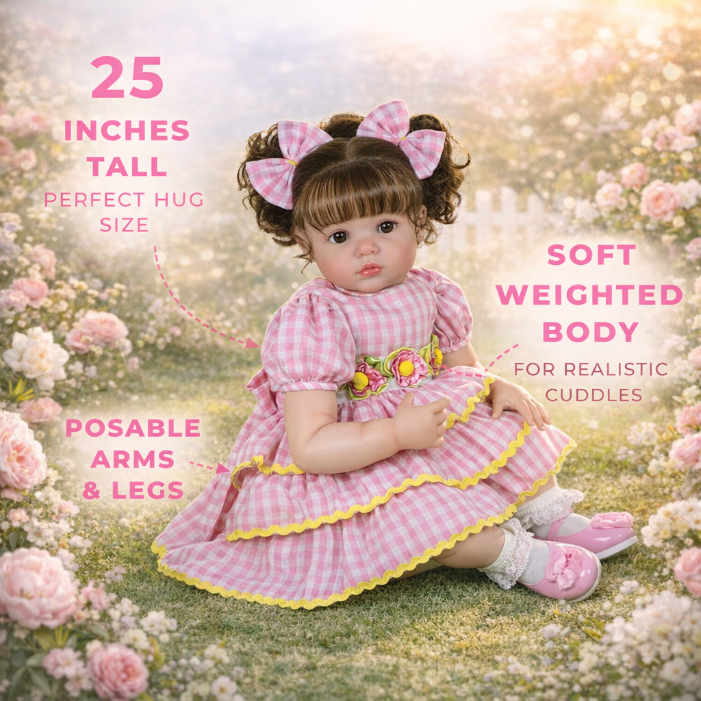 Lila Rose is an exquisite 25-inch lifelike reborn toddler, uniquely designed to offer the most authentic cuddle experience. Featuring a breathtaking combination of hand-rooted curly hair and a weighted cloth body, she captures the true essence of a soulful, growing child. Whether you are a dedicated collector or looking for a premier gift, this stunning 25-inch companion brings unrivaled realism and warmth into every home.
