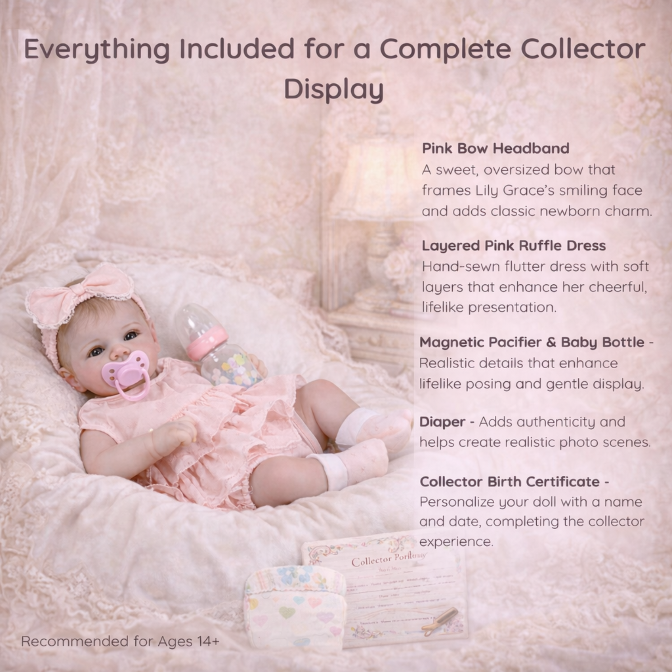 Dressed in a ruffled pink dress paired with a matching bow headband, Lily Grace arrives ready for display. Her accessories include a magnetic pacifier, bottle, socks, and a birth certificate, completing a thoughtful collector presentation. Each piece enhances her sweet, classic look and adds to the storytelling experience.