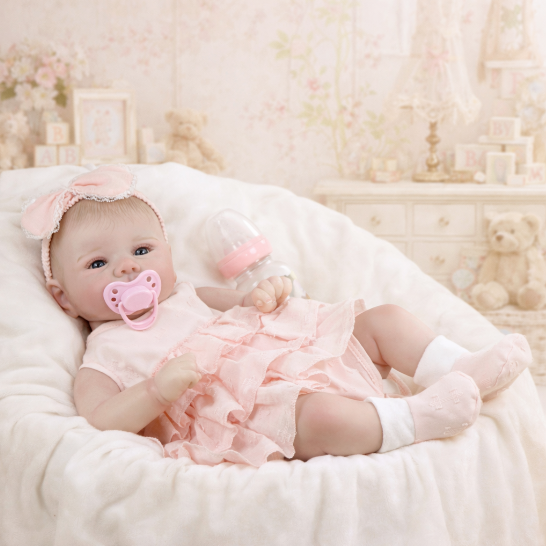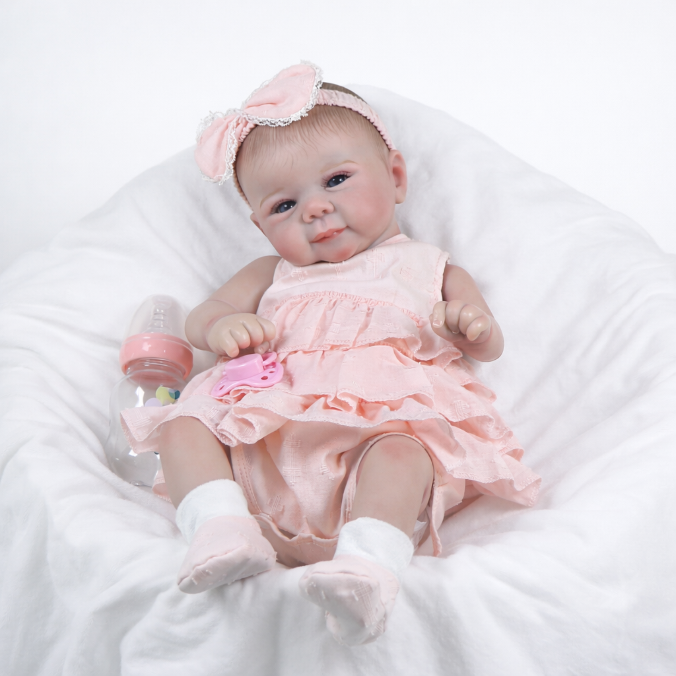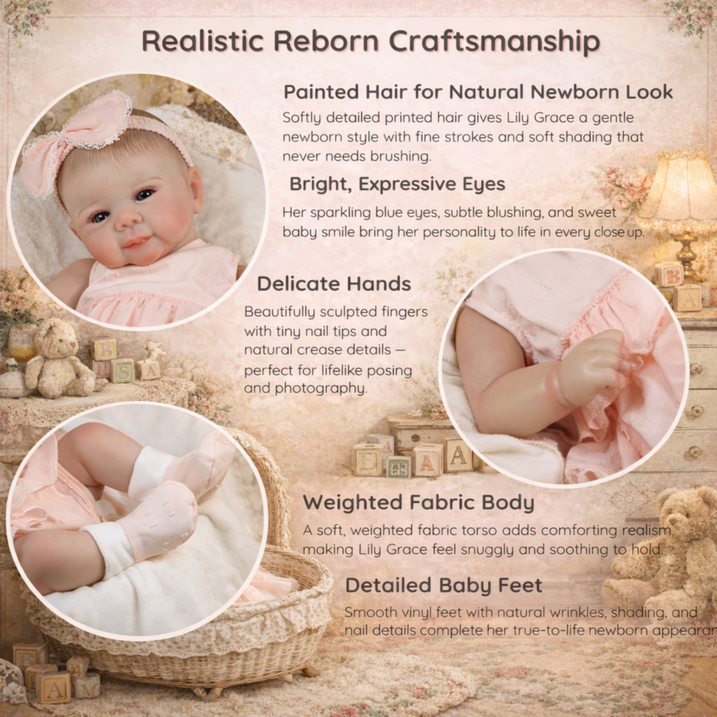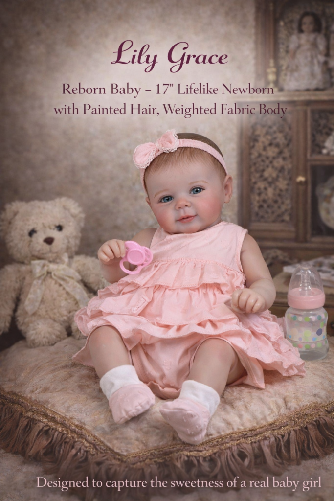 Meet Lily Grace, a 17 inch reborn baby doll created for collectors who adore joyful expressions and lifelike detailing. With her bright eyes, soft blush, and tender smile, she brings a warm and heartlifting presence to any collection. Every glance reveals carefully hand painted artistry that makes Lily Grace feel alive in your arms.