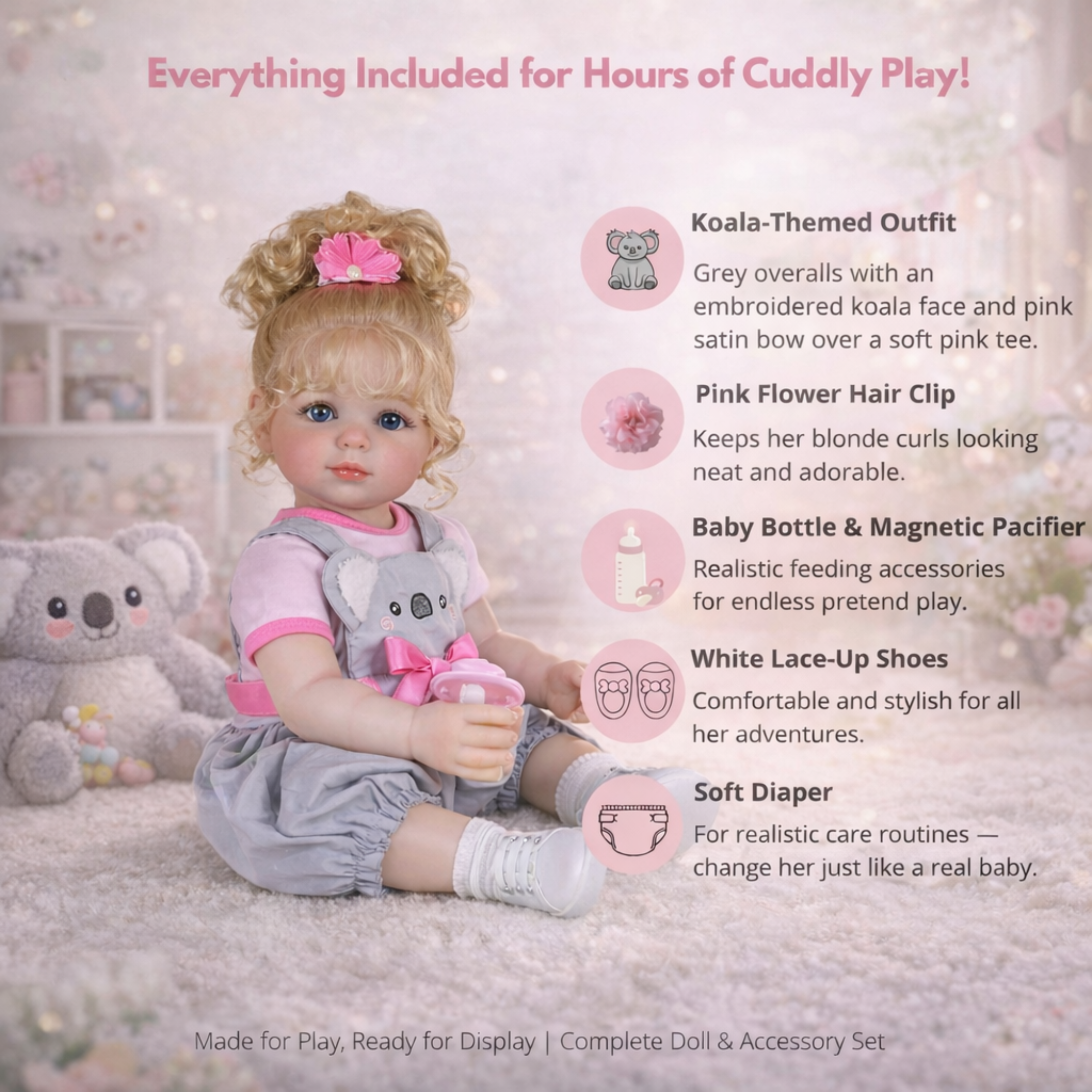 Luna Mae comes dressed in a cozy and stylish koala-themed outfit — a pink tee beneath grey overalls embroidered with a sweet koala face and finished with a bright satin bow. Her look is completed with white lace-up shoes and matching socks, giving her an adorable yet playful personality that children will adore.