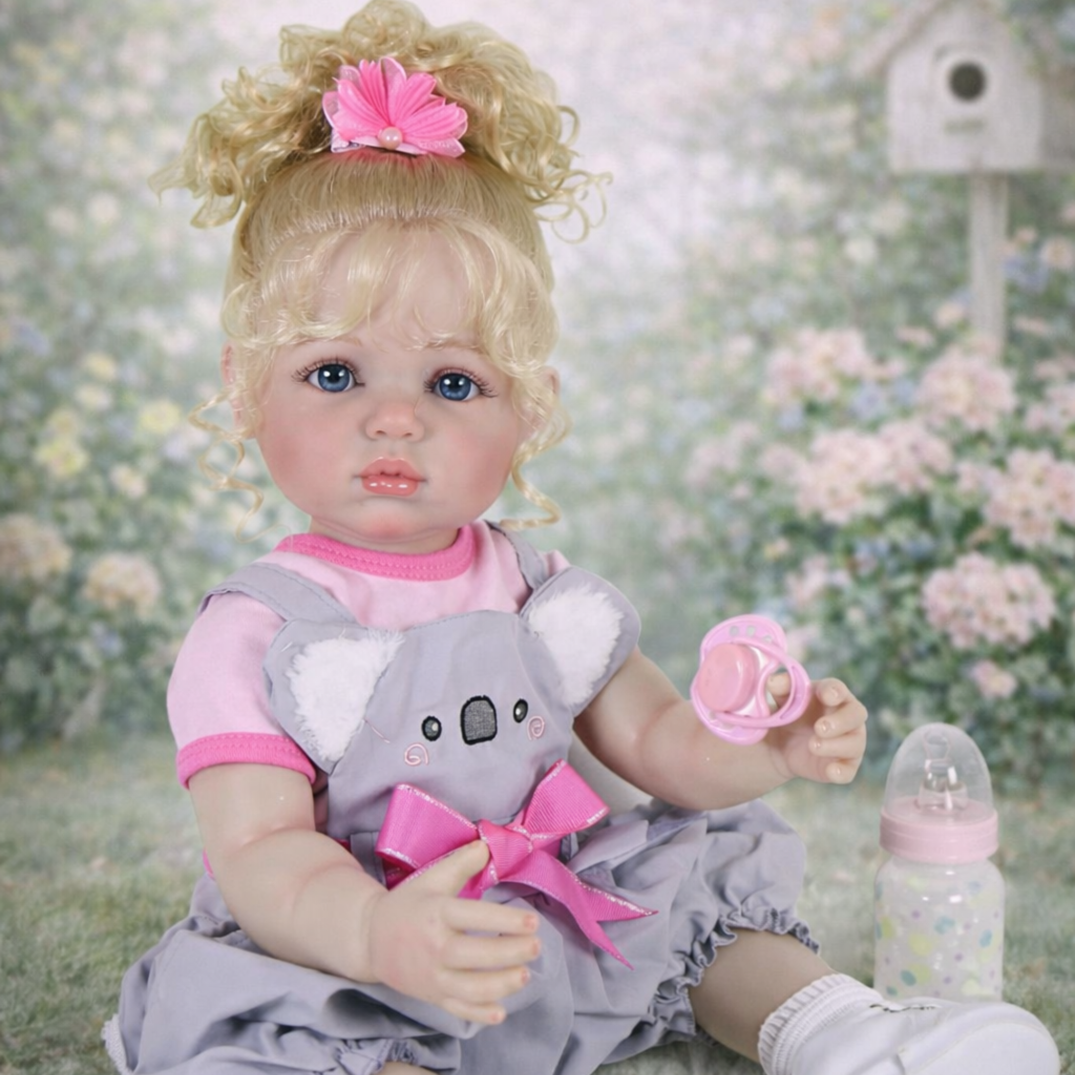 Her radiant blue eyes shine with curiosity, while her hand-painted 3D facial details — including soft blushing and visible facial veins — give her a gentle, lifelike glow. Each feature is lovingly applied by artists, from her glossy baby-pink lips to her natural skin tones that bring her expression to life. Her soft, rooted blonde curls are perfect for brushing, styling, and accessorizing with her pretty pink flower clip.