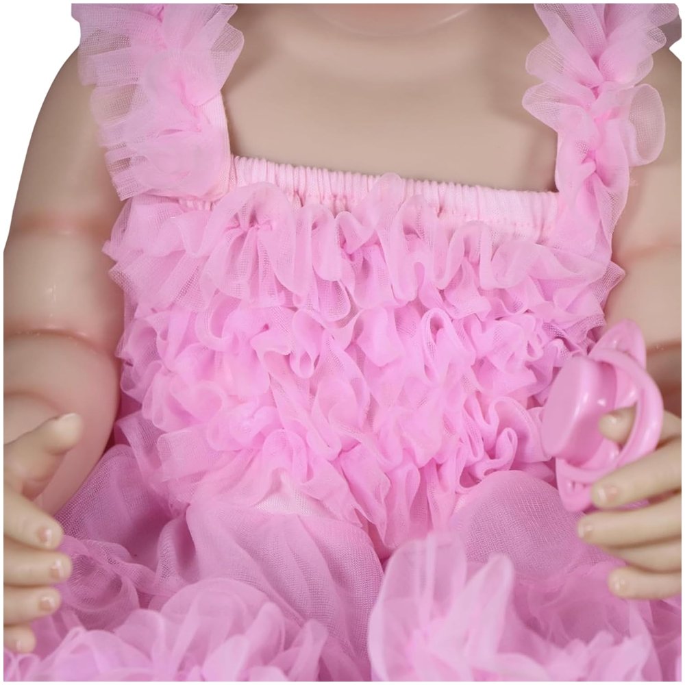 Madison comes dressed in her signature layered pink ruffle party dress, complete with matching bows and white shoes that sparkle softly in the light. Her outfit is fully removable, allowing for endless dress-up fun and personalization.