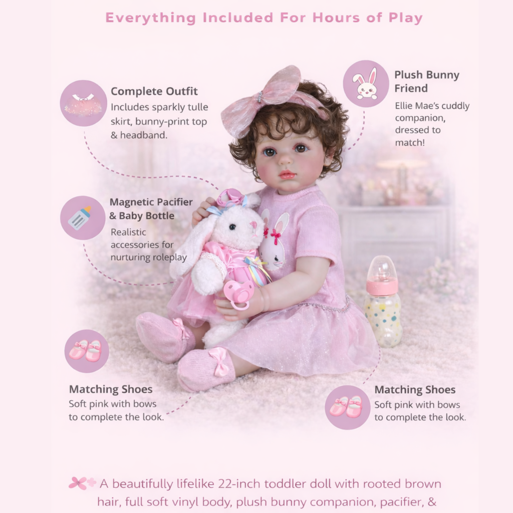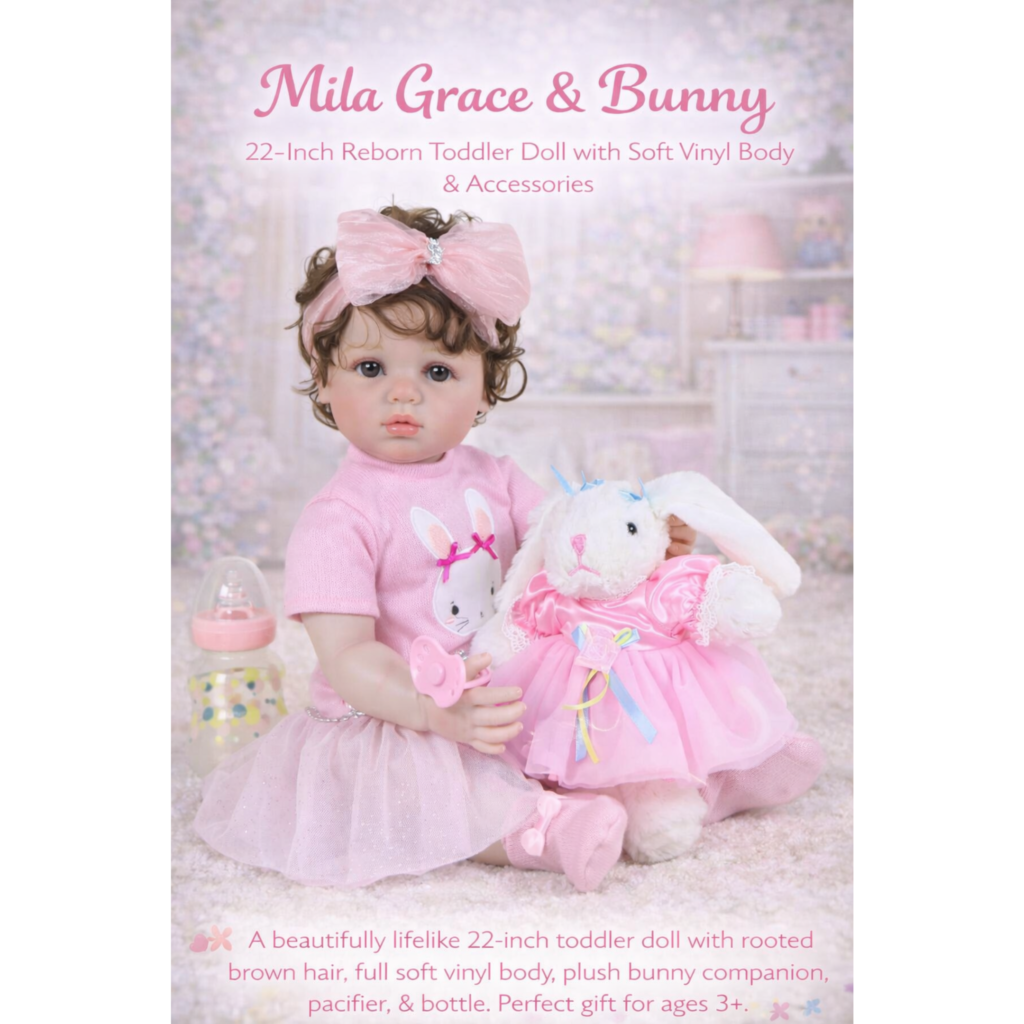 Each set comes gift-ready, complete with a magnetic pacifier, feeding bottle, shoes, diaper, personalized birth certificate, and her soft bunny friend. Whether for birthdays, Christmas, or as a keepsake for collectors, Mila Grace makes a lasting impression that warms hearts across generations.