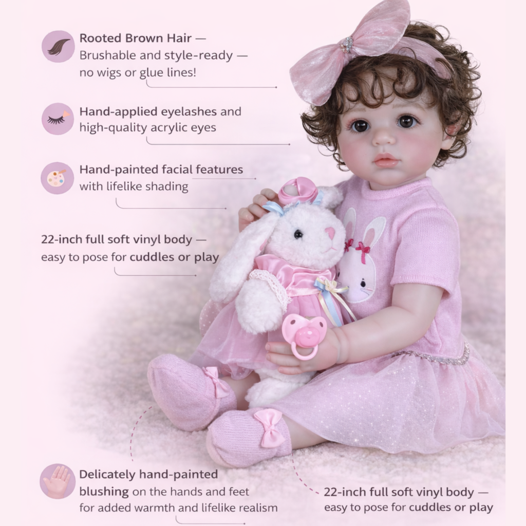 Her 3D hand-painted facial details reveal tiny veins and realistic skin texture, while her rooted brown hair allows for creative styling. Mila’s full-body soft vinyl design delivers a lifelike feel from head to toe, making every cuddle smooth and natural. There are no fabric seams or stiff joints—just pure realism that little hands can hold, bathe, and love.