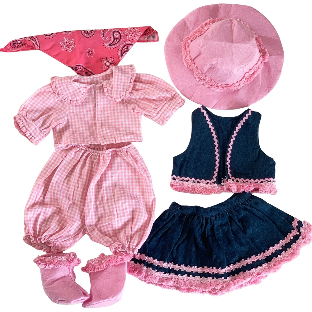 The look begins with a soft pink gingham top and matching bloomers, capturing the sweetness of vintage country fashion. Slip on the denim vest and ruffled denim skirt, both trimmed with delicate pink lace, and your doll instantly transforms into the cutest little cowgirl in town. The textures and colors work together to create a warm, playful, and picture perfect Western theme.