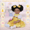 Meet Sunny Mae, a radiant 22-inch lifelike African American baby doll designed to capture the beauty of diversity. Expertly crafted with a premium full vinyl body and expressive brown eyes, she radiates a realistic warmth that feels truly special. Dressed in a cheerful yellow floral outfit, she is a heartwarming companion designed for posing, interactive play, and endless smiles.